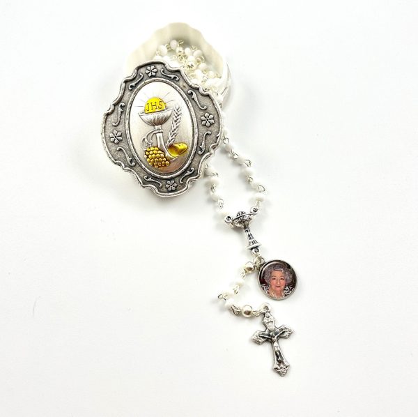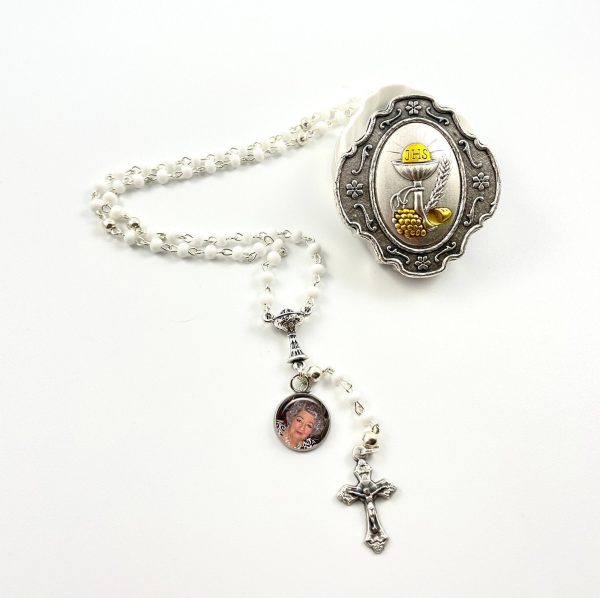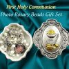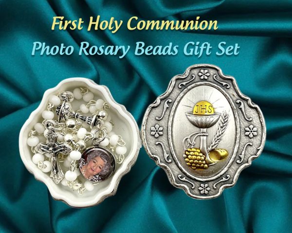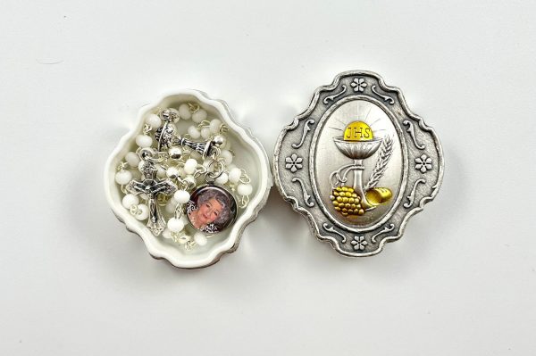 Celebrate First Holy Communion with a very personalized gift. We’ve taken this beautiful child-size Rosary Beads to another level, by adding a photo charm (10mm -dime size) with your picture of the child or a relative you wish to honor. Suitable for a girl or a boy. They are White Glass beads with silver finish link, silver polished Our Father beads, silver finish Chalice in center and an oxidized Crucifix. The Rosary Gift Set comes in a Collectible Metal box (silver & gold tone) with the Sacrament of the Eucharist on the lid. Made in Italy.