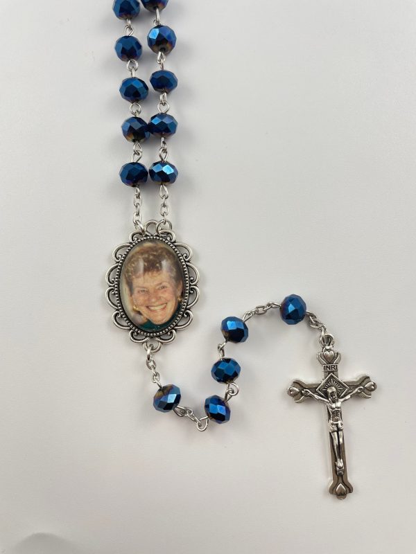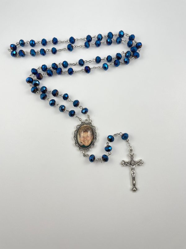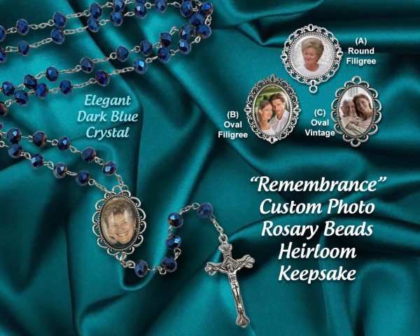 Estos hermosos rosarios de cristal azul están hechos con su foto favorita que se le enviará cuando haga su pedido. También se puede crear un segundo lado con un gravado especial, nombre/fecha o incluso otra foto. Consulte el menú desplegable cuando realice su pedido para conocer otras opciones. Cada juego de cuentas de rosario está bellamente exhibido dentro de una elegante caja de regalo forrada de fieltro negro que se INCLUYE con su compra.