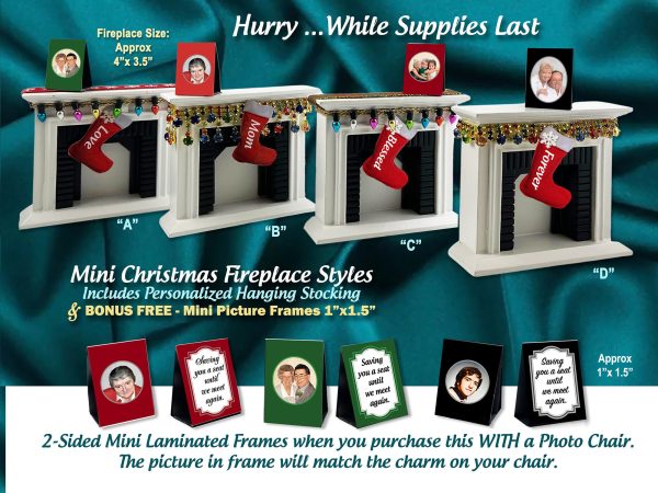 Chairs may be purchased separately with our "a la carte" selection of accessories. OR… buy our full Deluxe Set (as shown in listing) which comes complete with matching mini Fireplace including a realistic laminated personalized hanging Christmas stocking with your loved ones title or name (such as “Dad” or actual name). A FREE BONUS I just added to the fireplace is a miniature 2-sided frame which has a favorite sentiment (as shown) on one side and your photo (from your chair) repeated on the back. Also included in the Deluxe Set is a matching LED miniature Christmas tree – battery operated (included). LED Trees come in 2 sizes (7" & 9") which light up. An additional upgrade option is an Acrylic mirror base (6"x 9") for “Deluxe Sets”, to be purchased separately.