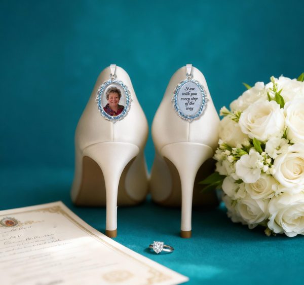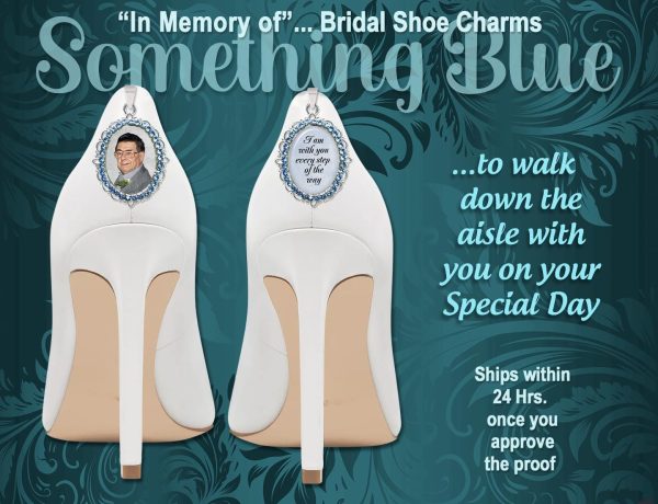 An incredible “finishing touch” for your wedding day! These beautiful blue rhinestone filigree shoe charms will hold your Loved One with you as you walk down the aisle. An honorable way to memorialize someone who cannot be with you. Very symbolic and heartwarming all at the same. time. Your photo will be personally designed and handcrafted by me with the elegance and dignity it deserves for your Special Day. If you want to add more “Something Blue” I would be honored to put a subtle Blue Background (within your picture) to give it dual meaning. See color choices in my other photos of this listing. Can also be personalized with your wedding date as well.