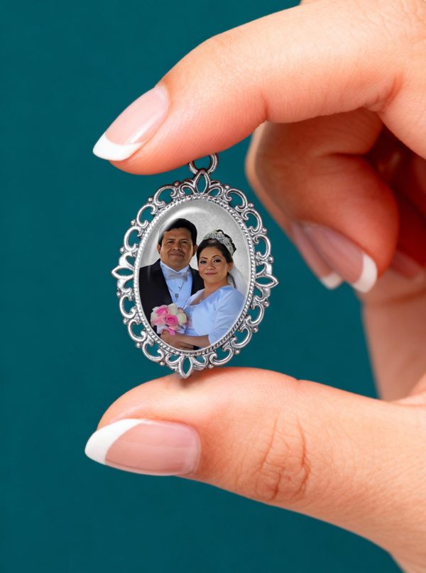 Each charm features a decorative ribbon bail — ribbon included — so you can easily tie the keepsake to your bouquet handle. This design can be created with 1 to 3 linked filigree charms, each holding a photo or verse, allowing you to honor multiple loved ones or combine a picture with a meaningful sentiment.