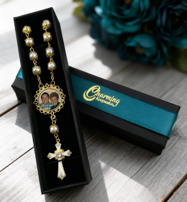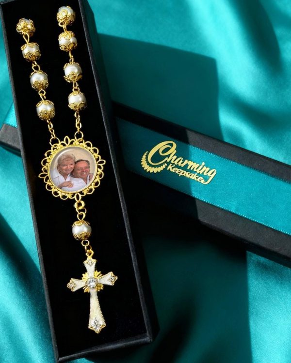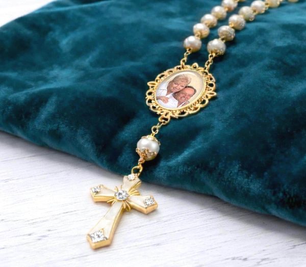 This elegant, high-quality white-gold glass pearl rosary (8mm bead size) is a beautiful and meaningful way to keep your loved ones close, while on the road or for any special occasion. Each rosary features YOUR picture which you will submit after you place your order, and I will restore, enhance and brighten your photo (no extra charge) to bring it back to life. Then, it will be securely embedded into the charm bezel, with a protective glass dome covering… allowing you to keep your most cherished memories and loved ones with you in prayer wherever you go.
