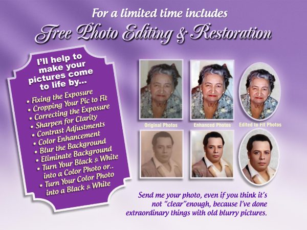 What sets us apart is the careful restoration, editing, and enhancement of every photo submitted. We lovingly refine each image — removing damage, adjusting light, and restoring clarity — so your loved one is represented with beauty and respect.