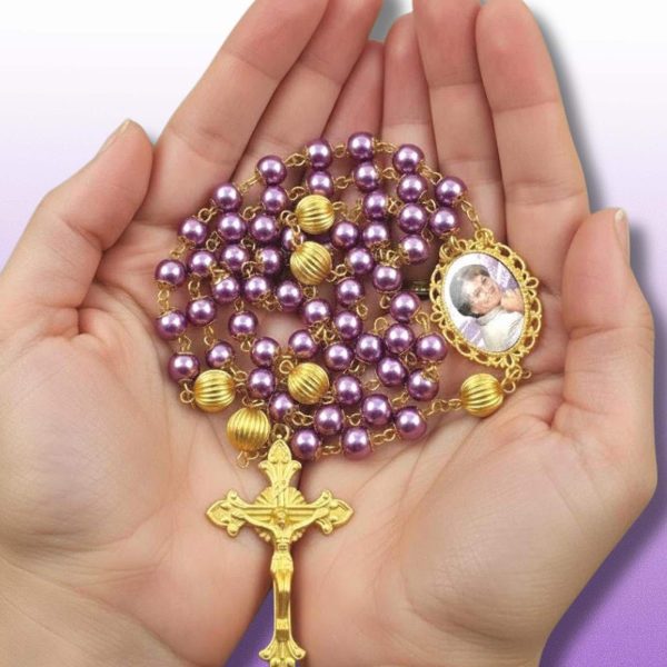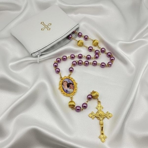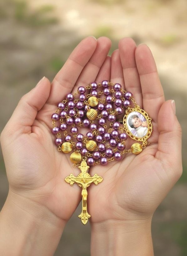 This handcrafted Catholic photo rosary features rich purple glass pearl beads paired with gold-accented detailing — a meaningful tribute that reflects both faith and compassion.