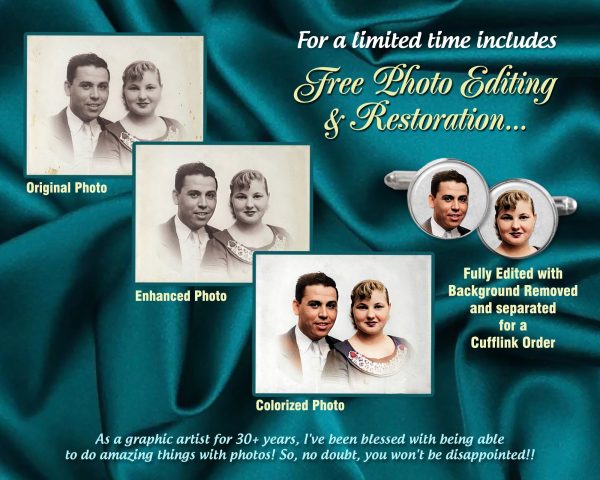 Personalized Photo Cuff Links – Wedding Day Cufflinks-Custom Made for Father of the Bride, Groom, Best Man, Groomsmen, Father of the Groom, Grandfathers, Stepfathers, too. Available in 6 colors: Silver, Antique Bronze, Platinum, Rose-Gold, Golden, Copper. If you don’t see what you were hoping for, please ask me, as I have not listed all my items. Size: 16mm Round (size of a dime) and includes Beautiful “lined” Gift Box ready for gift giving!