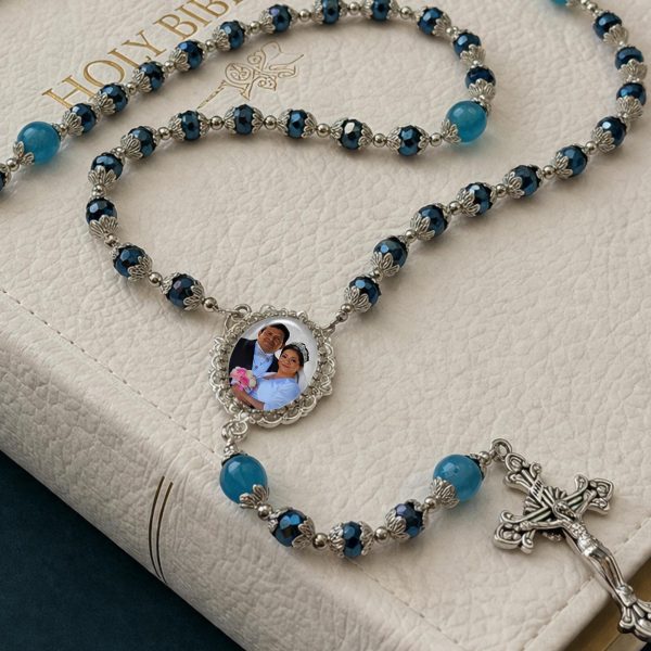 These large elegant Deep Blue Glass Crystal & Agate Stone Rosary Beads are handmade with YOUR favorite photo which you will send to me when you place your order. A second side can also be created with your special sentiment, name/date or even another photo. See drop-down menu when you place your order for other options. Each set of rosary beads are beautifully displayed inside an elegant black felt-lined gift box which is INCLUDED with your purchase.