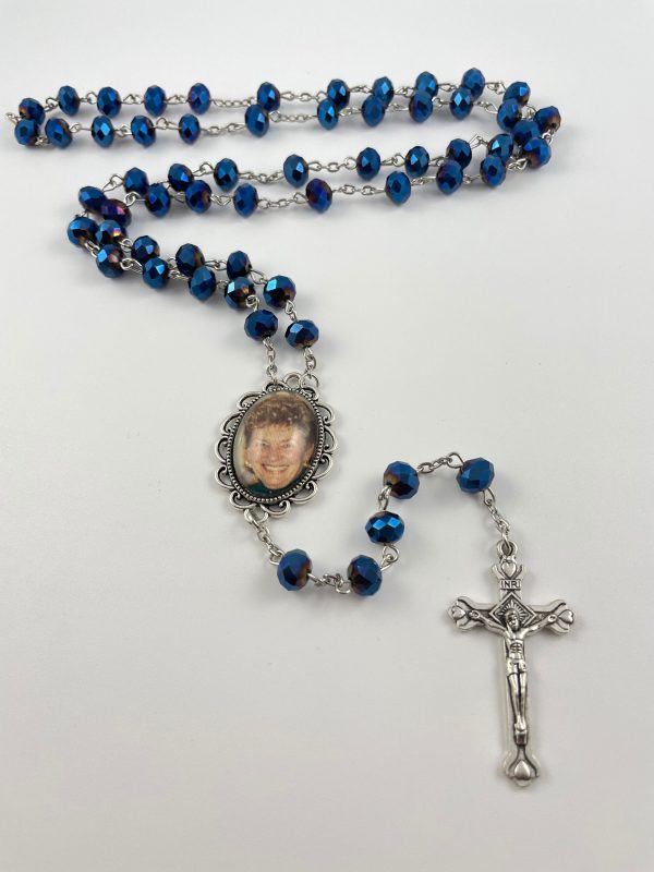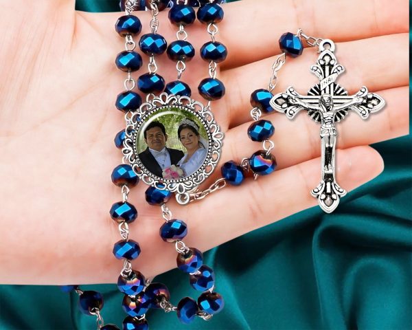 These beautiful Dark Blue Crystal Rosary Beads with your own photo, is guaranteed to become a favorite keepsake for family and friends. The photo charm portion, itself, is hand crafted by me, sealed under a dome glass which helps magnify the photo. Each set of rosary beads are beautifully displayed inside an elegant black felt-lined gift box which is INCLUDED with your purchase. They can be customized to be 2-sided (with name & date or another photo) on other side of photo pendant. NOW OFFERING (no charge) a religious picture of your choice can be added on the back, as well, if you would rather have that.