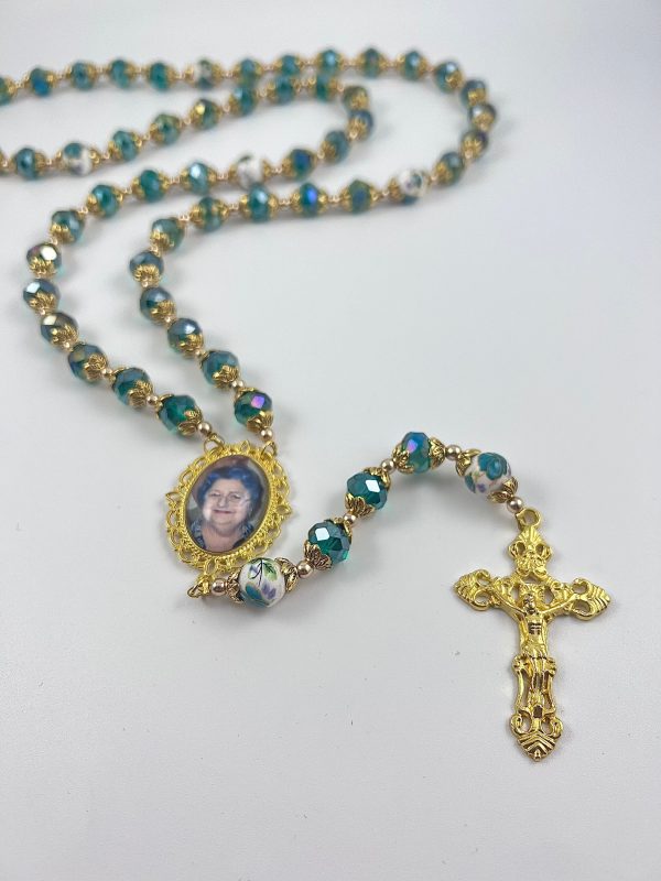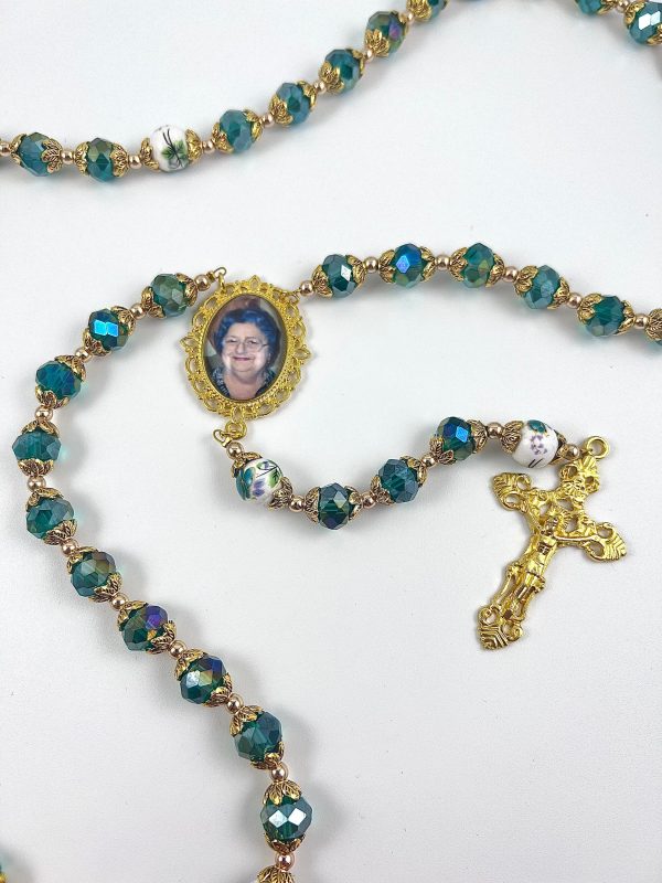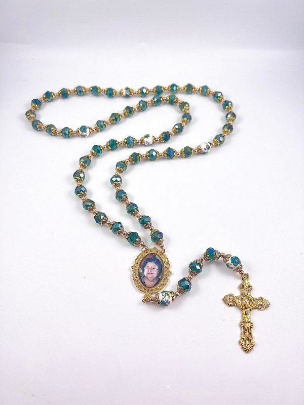 ((Beautiful large 10mm crystallized beads with round white green flower glory beads made of ceramic)) crucifix are made with YOUR favorite photo which you will send to me when you place your order. A second side can also be created with your special sentiment, name/date or even another photo. See drop-down menu when you place your order for other options. Each set of rosary beads are beautifully displayed inside an elegant black felt-lined gift box which is INCLUDED with your purchase.
