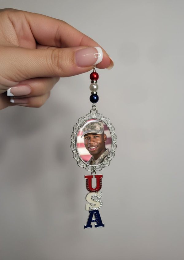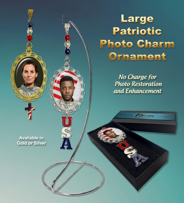 Honor a hero with this handcrafted Patriotic Photo Charm Ornament personalized with your photo. Includes free photo restoration and choice of gold or silver finish.