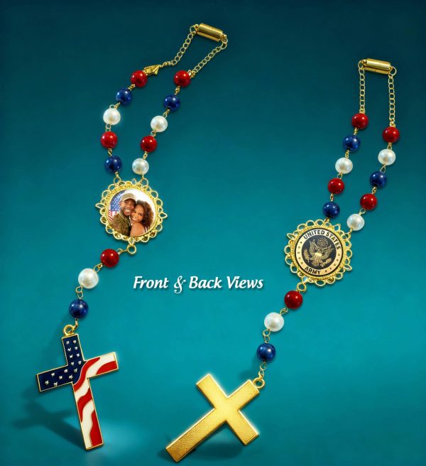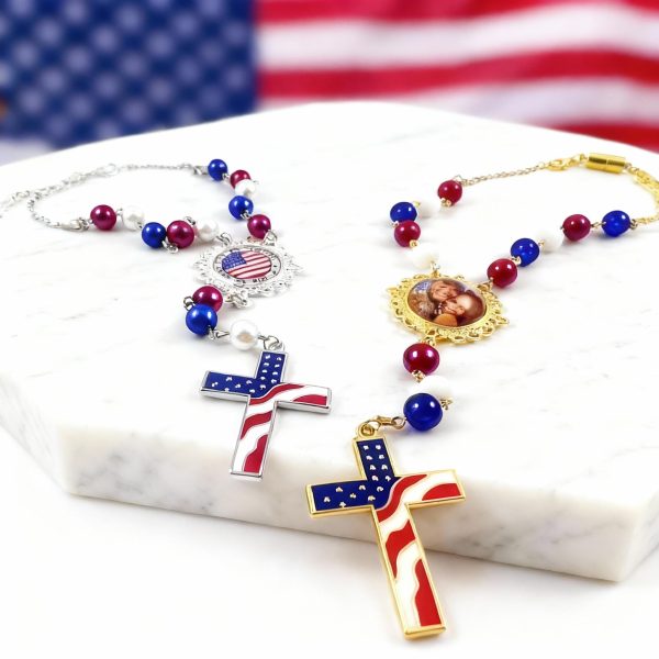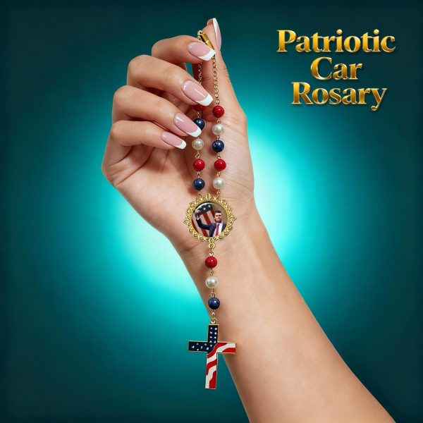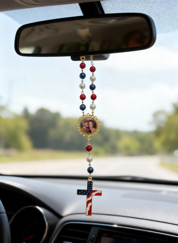 Celebrate faith and country with this Patriotic Car Rosary. Portable and travel-sized, it features red, white, and blue beads, a custom photo charm, and a USA flag cross — a meaningful rearview mirror accessory and heartfelt gift for military families, veterans, and patriots.