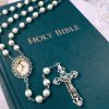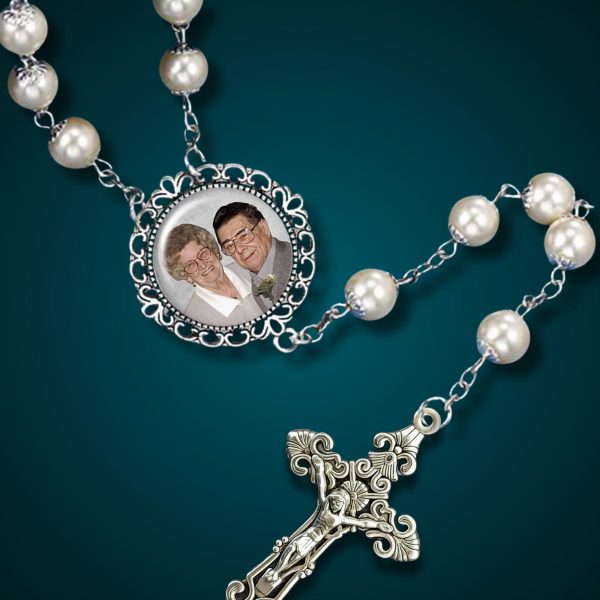 This beautiful WHITE glass pearl -Silver Crowned Rosary Beads is made with YOUR favorite photo which you will send to me when you place your order. A second side can also be made with your special sentiment or name/date. See drop-down menu when you place your order for other options. No doubt, they will become a treasured heirloom. Makes an awesome and memorable gift keepsake for a new bride, or a 50th Anniversary gift, Confirmation, Quinceañeras or Memorial Remembrance … A symbolic & thoughtful gift of hope and prayer to those you love and for any occasion.