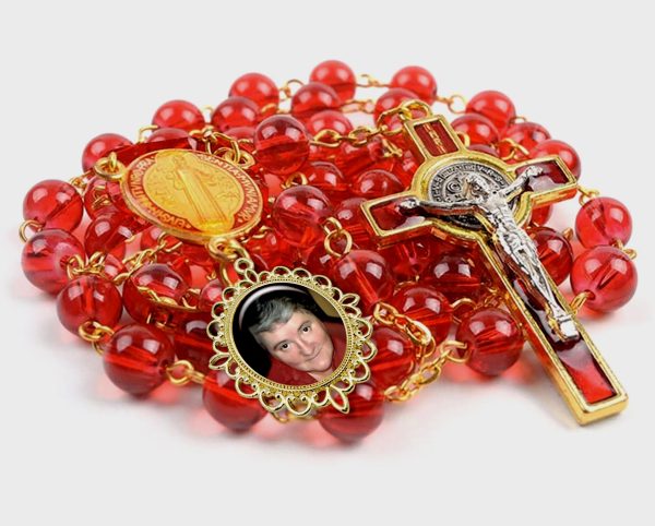 This beautiful gold linked Glorious Red Saint Benedict Rosary with gold/red St. Benedict medal are made with YOUR favorite photo which you will send to me when you place your order. A second side can also be created with your special sentiment or name/date. ALSO… JUST ADDED… If you want to consider a stunning Rosary Keepsake box to compliment these rosaries, I'm now offering this Pewter color, velvet lined, Last Supper Trinket Box. See drop-down menu when you place your order for all these added options. Each set of rosary beads are beautifully displayed inside an elegant black felt-lined GIFT BOX which is INCLUDED with your purchase. (Trinket Box sold separately)