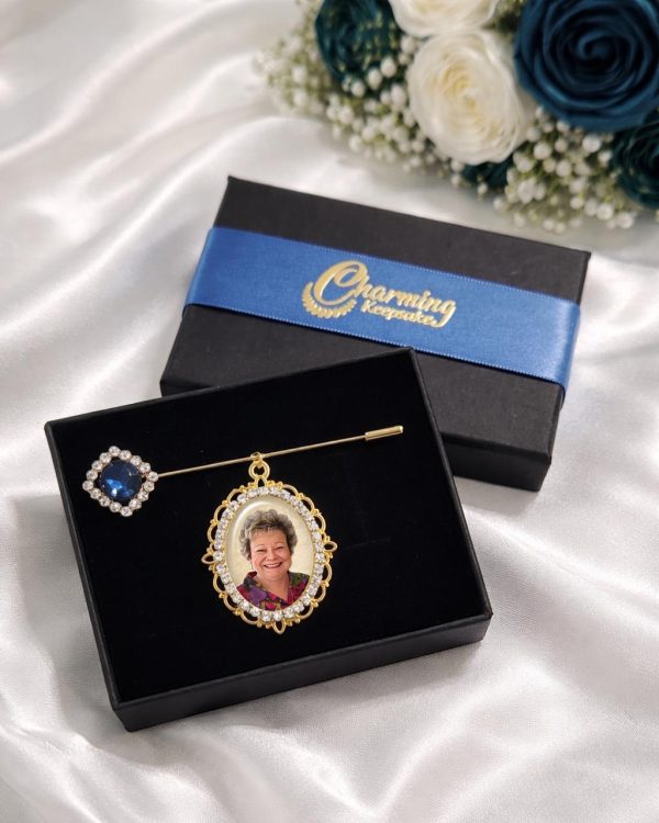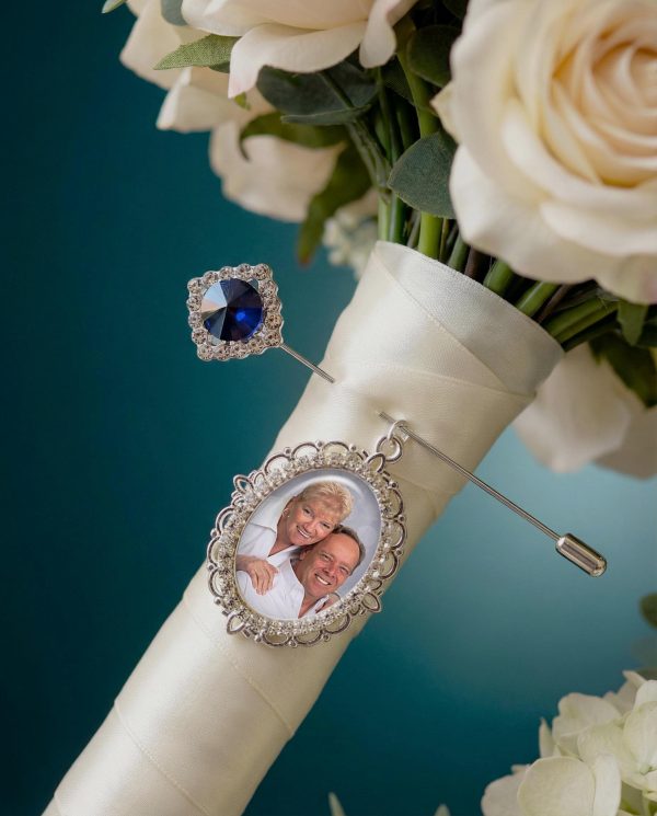 A beautifully handcrafted Something Blue Stick Pin featuring a sparkling sapphire crystal and an elegant photo charm. A timeless way to carry someone you love on your wedding day. Includes free photo restoration, fast proofs, and jewelry-quality gift packaging.