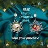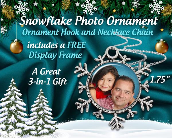 To help celebrate our Grand Opening, we've created this 3-in-1 Gift. This Holiday Snowflake Christmas Photo Ornament, now includes an elegant ornament hook, 24" Rolo necklace chain and a FREE Floating Display Frame with stand, using your personalized picture for a Christmas tree ornament and remembrance Photo Keepsake. Now you can even wear it as necklace after the holidays or display on a shelf or desk. This metal, silver tone round snowflake ornament is beautifully gift boxed in a velvet lined box. Comes with a Ornament Hook to hang your pendant on a Christmas tree and a matching pendant chain.
