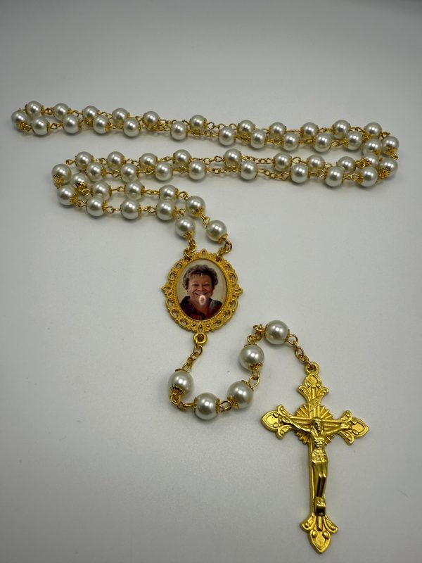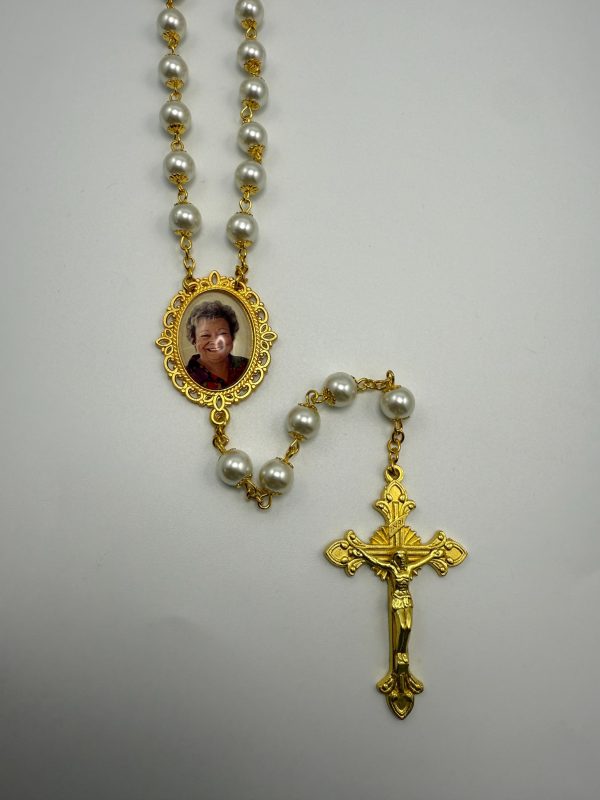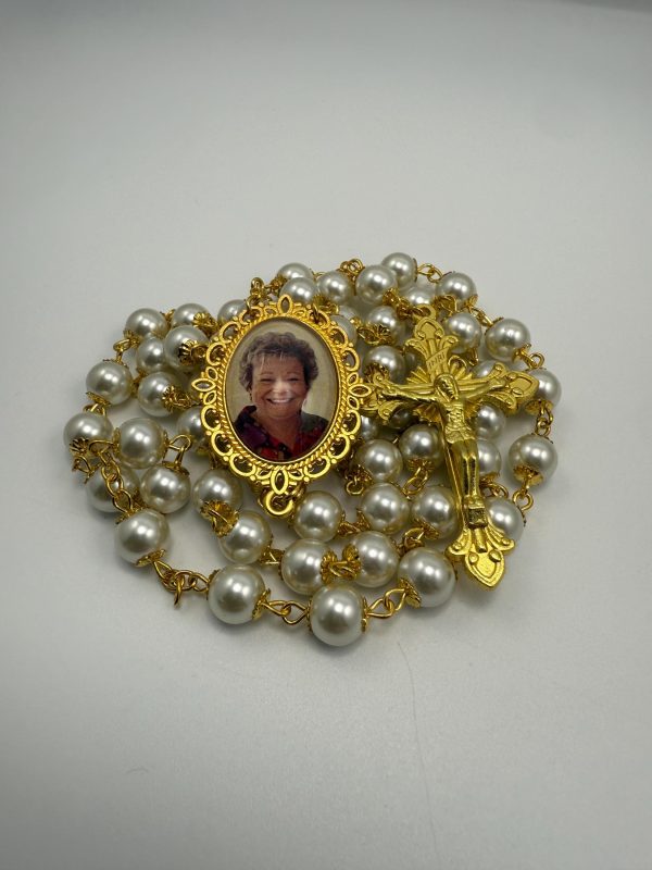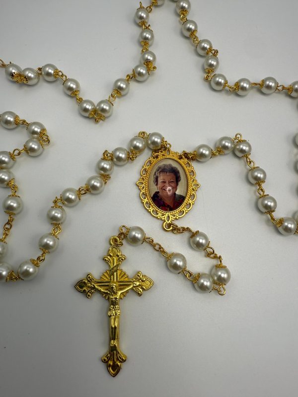 This Bridal Rosary will most definitely compliment the Sacrament of Marriage during the wedding and long after. Elegantly designed, they are heavier than the average, large 22” long, 8mm beads with gold finish capped pearl beads, gold finish links and gold tone crucifix (made in Italy). The personalized photo charm is designed and created by me, using YOUR photo. No doubt, they will become a treasured heirloom. Makes an awesome and memorable gift keepsake to honor that special someone you love and miss. A symbolic & thoughtful gift of hope and prayer to those you love and for any occasion.