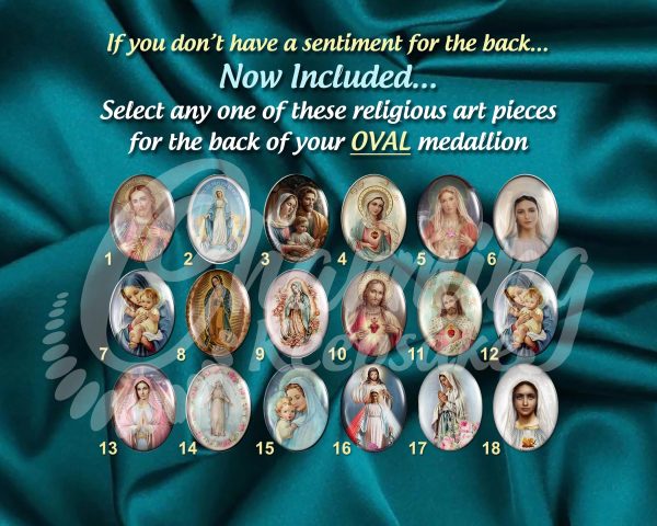 At this moment we have this charm in gold tone oval filigree to match the rosary. The size of your photo in the charm/ medallion will be approximately 1” (18x25mm).